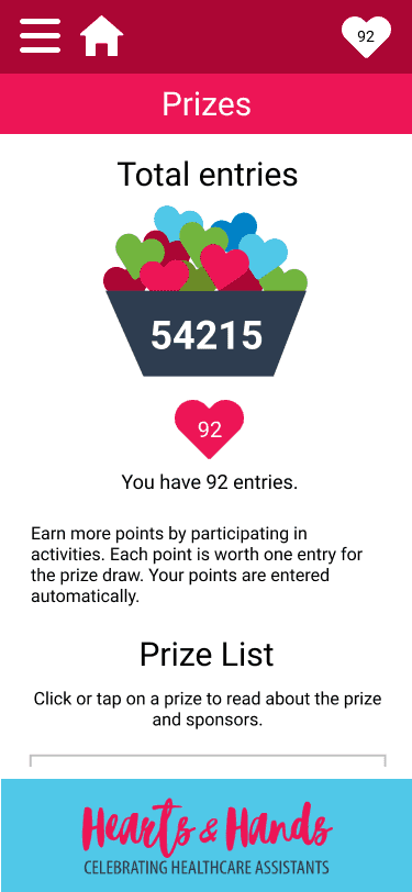 To meet the goals of the Hearts & Hands 2020 event, we developed a web-based event app to deliver a content rich and user-friendly experience. On top of the features that supported the main aspects of the event, we designed gamification features that allow participants to earn points as they engage in each activity.